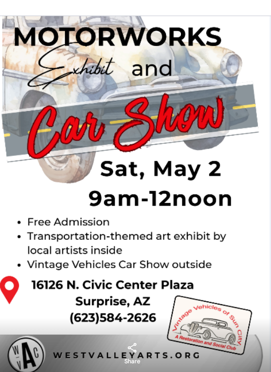 Join us for a car show plus music, Kettle corn, Hamburgers and cool cars from 11am – 1pm at 17271 N 87th Ave in Peoria, Az  It is Herb Carsons place.